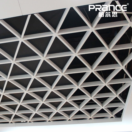 第二種為鋁型材三角格柵吊頂系統(tǒng)主要有鋁通、鋁柱及鋁蓋三部分組成,組裝款式有三角型和六角型。鋁型材三角格柵的型材方通的厚度一般為0.8mm、0.9mm、1.0mm,方通規(guī)格為25*50mm、25*75mm、30*80mm、25*100mm、40*80mm及40*100mm,三角形格子的大小可定制150*150mm、200*200mm、250*250mm、300*300mm、400*400mm、500*500mm、600*600mm及800*800規(guī)格,表面涂層一般選擇粉末靜電噴涂或聚脂漆噴涂,也可選用輥涂、拉絲表面處理。常用顏色為乳白色、黑色,也可根據(jù)要求訂做其它顏色。不同的顏色搭配可以表達出不同的個性特點。